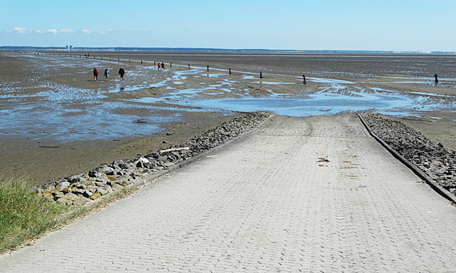 Wattweg nach Neuwerk: Priele + feinster Schlamm, Pricken ( Priggen ) markieren den Weg